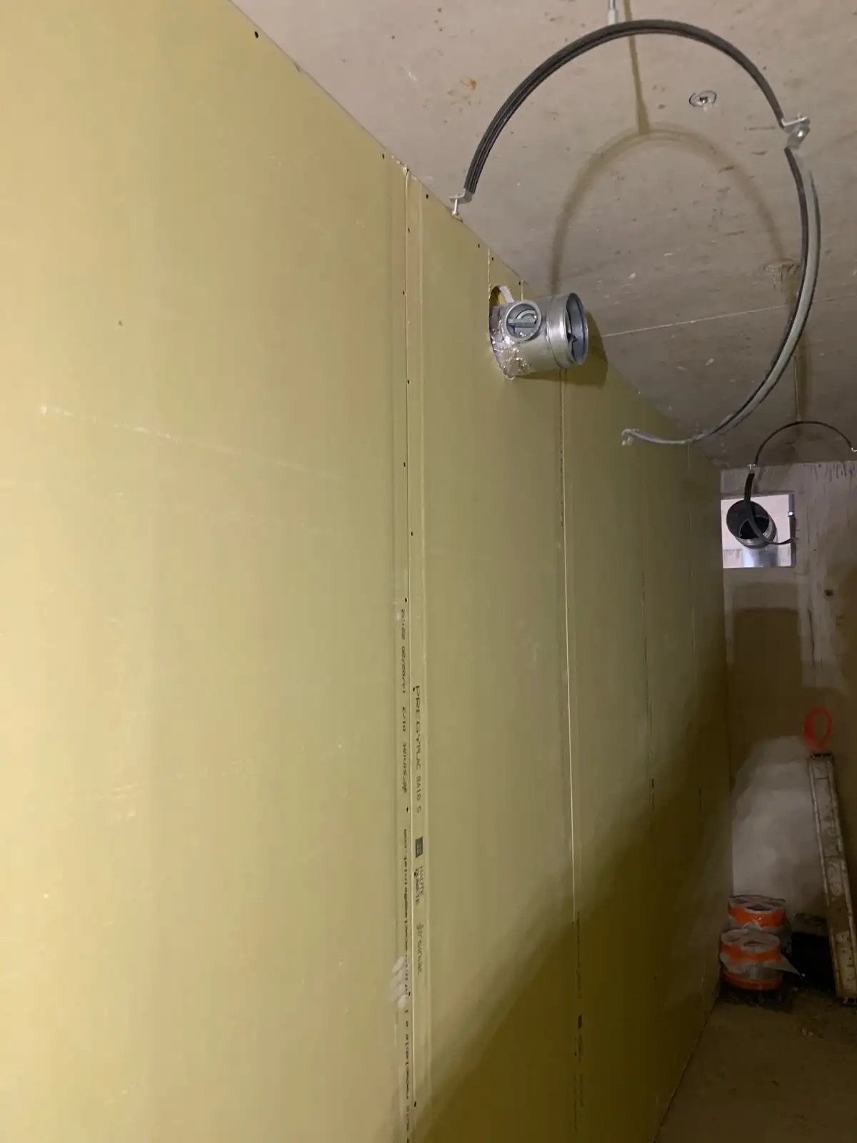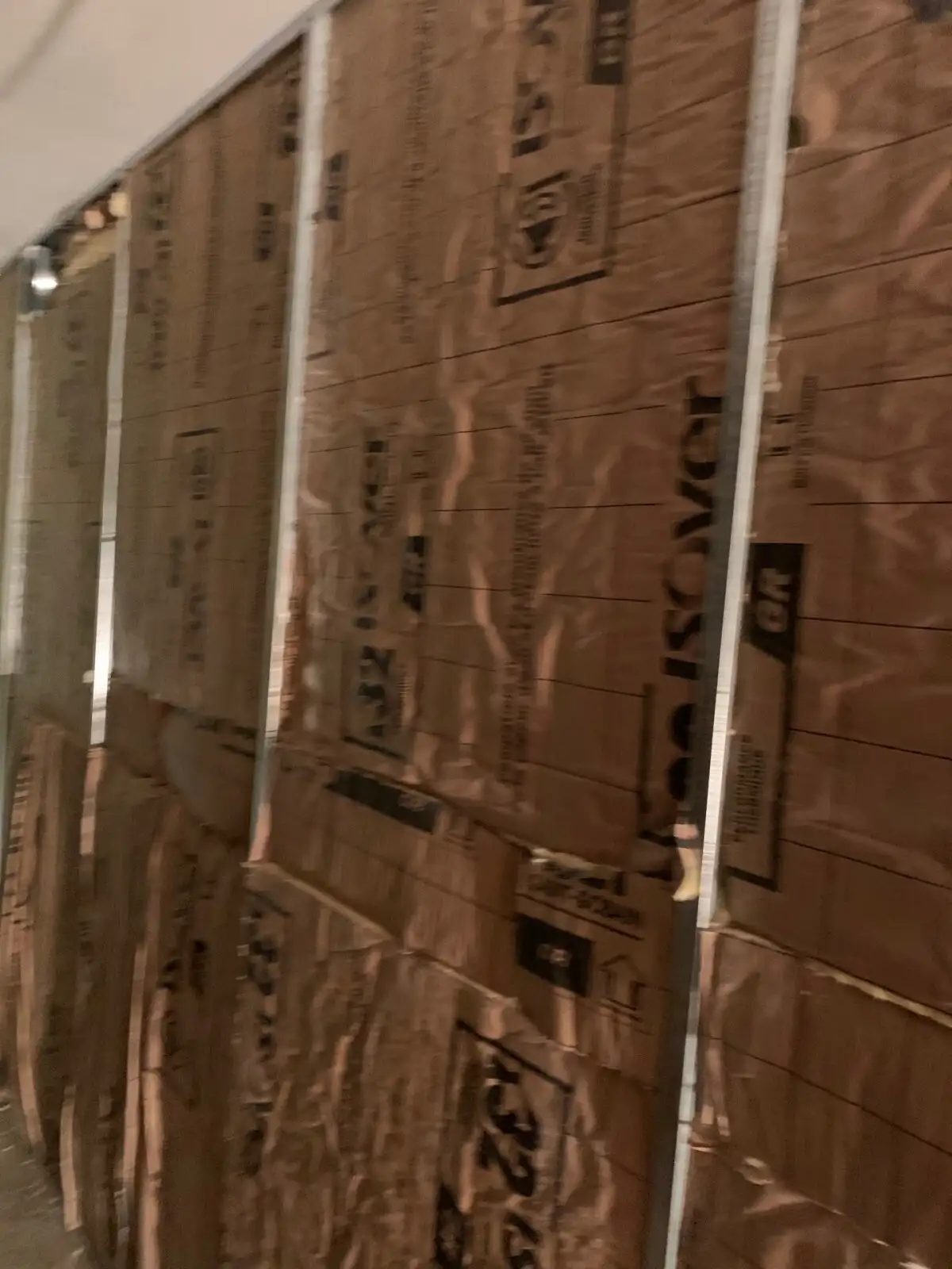 Ensuite pose de montant M48 en 260 cm, fixation des montants tous les quatre-vingt-dix centimètres afin de poser de plaques de plâtre type BA 18 S. Avant la pose des plaques, découpe et pose de laine verre GR 32 Kraft épaisseur 85 mm résistance thermique de 2.65 m² k/w Acermi 02/018/100. Par la suite, préparation et découpe sur mesure de plaques de plâtre type BA 18 S (plaque de plâtre BA 18 S , c’est une plaque de plâtre de BA 18 de largeur quatre-vingt-dix centimètres) par mode de vissage avec des visses de 25mm. Ce système de doublage optima avec plaque de plâtre type BA 18 permet un coupe feu de 1 h.