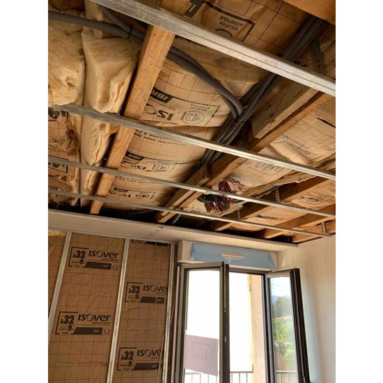 • Rénovation et création d'un faux plafond en plaques de plâtre BA-13 avec isolation en laine de verre IBR KRAFT 300mm R=7.50m² K/W ACERMI 02/018/052,