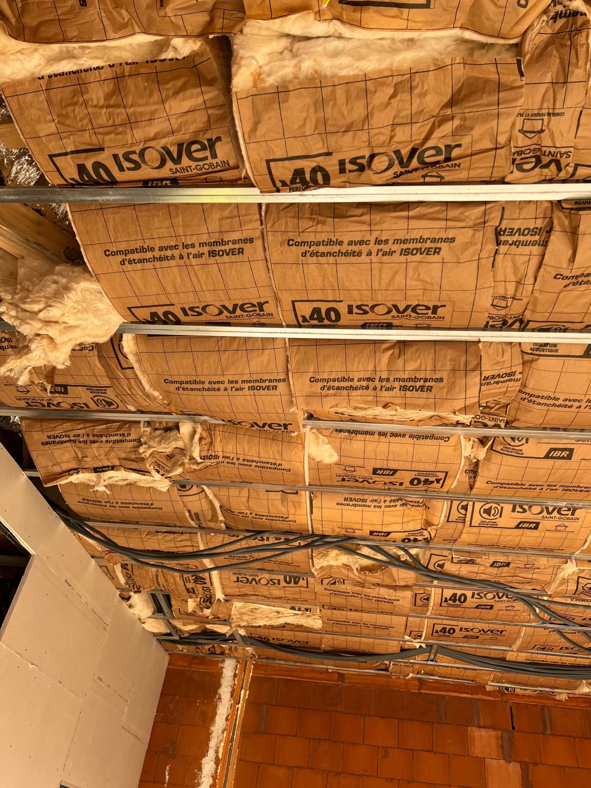 Plaquiste, isolation faux plafond des combles avec laine IBR 300mm sur une ossature métallique, plaque de plâtre BA13 dans une villa neuve à Allauch 13190.